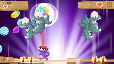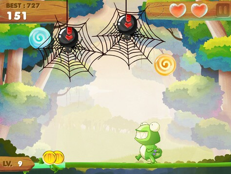 操作采用的是重力移動(dòng)外加點(diǎn)擊取物的方式,而且是點(diǎn)擊屏幕任意一點(diǎn)都可以讓變色龍吐出舌頭將糖果收入腹中,就整體來說其手感還是比較順暢的。游戲開篇會有詳細(xì)的講解教程,基本上玩家都可以輕松上手。游戲的玩法也是非常簡單的呢,每當(dāng)在糖果落下之前,讓變色龍伸出長長的舌頭將糖果吃掉就可以了。當(dāng)然其中還參雜了有毒的糖果,并時(shí)不時(shí)會有食人魚和巨型蜘蛛出現(xiàn),游戲中除了要掌握好舌頭吐出的時(shí)機(jī)之外,還要四下留意各種明槍暗箭,當(dāng)然在這里指的是落石,食人魚、瓢蟲、蜘蛛以及毒糖果。其中數(shù)落石和食人魚的威脅性最大,它們會從屏幕的上下方出現(xiàn),但也并不是無跡可循,在它們現(xiàn)身之前,游戲會用一個(gè)感嘆符號來提示相關(guān)的出擊地點(diǎn),稍微移動(dòng)即可躲開。