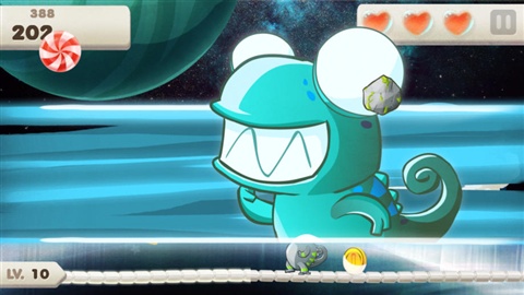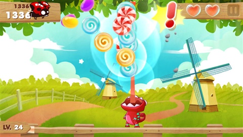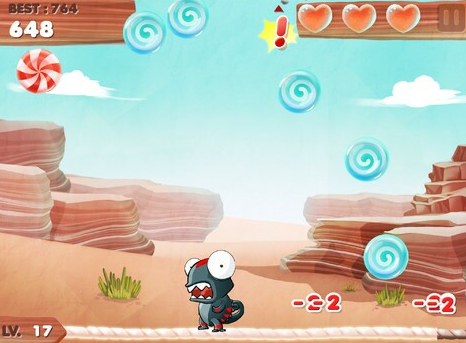 隨著小變色龍吃的糖果越多,游戲的等級也會越來越高,這時(shí)!不知道哪里來的食人魚就會出現(xiàn)在我們的畫面當(dāng)中!食人魚出現(xiàn)前地面上會有感嘆號作為提示,玩家要適當(dāng)?shù)囟汩_它們喔!(真想知道這魚到底是怎么來的?。┤缓蟛恢挥X連瓢蟲蜘蛛都出來了!大家一起來阻礙小變色龍吃糖果!搶走我們的心心,黏住舌頭讓我們動(dòng)彈不能!你們都是約好的么!我吃顆糖容易么!除了動(dòng)物們會出現(xiàn)阻礙我們的小變色龍吃糖果之外,天上還會掉下來石頭,噢天!千萬別被砸中囖!每當(dāng)小變色龍失誤一次,就會扣掉一個(gè)心心,當(dāng)3顆心心都失去后游戲就會結(jié)束的!