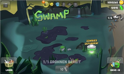 僵尸獵手游戲中綠皮怪與機(jī)器人小伙伴駕駛著一艘飛碟到一片沼澤中尋找外星人的蹤跡,當(dāng)飛碟停止時(shí),就可以降落開(kāi)始進(jìn)行抓捕僵尸的游戲了。僵尸們都躲在地下,有僵尸的地方會(huì)出現(xiàn)一個(gè)大腦的圖標(biāo),玩家需要丟出粉紅色的腦子去引誘僵尸們,不過(guò)這些僵尸都是一些膽小的家伙,丟下腦子后僵尸所處的地方就會(huì)出現(xiàn)一個(gè)感嘆號(hào),遠(yuǎn)離感嘆號(hào)至不會(huì)變成黃色的位置,僵尸們就會(huì)爬出來(lái),這時(shí)候就趕緊抓住機(jī)會(huì)趕上去使用SM皮鞭將僵尸捕獲。