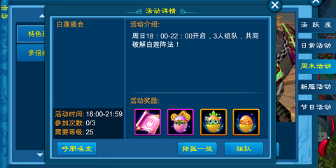 周日18:00-22:00開啟,3人組隊(duì),共同破解白蓮陣法!有大量極品仙寵,靈南仙果,天賦仙書4階卷軸等你來(lái)拿。