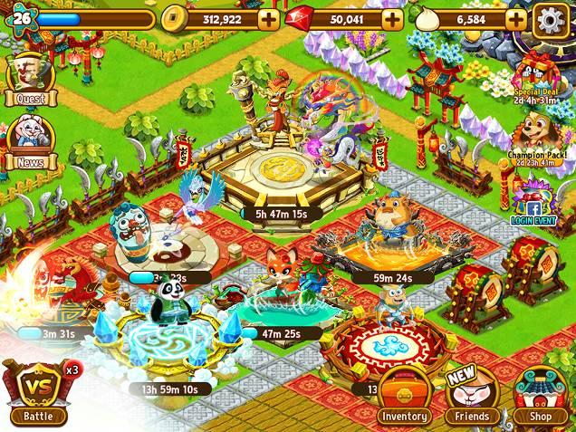 功夫?qū)櫸镉螒蛑?,玩家首先要?gòu)建屬于自己的專(zhuān)屬召喚秘籍,或是與好友們分享召喚術(shù)的組合公式,然后就可以開(kāi)始著手收集各式寵物了。在游戲中統(tǒng)共設(shè)計(jì)了有70余種從造型到屬性特點(diǎn)再到招式技能都各不相同的功夫?qū)櫸?,玩家在收集到他們之后,還要通過(guò)喂食各類(lèi)精美食材的方式來(lái)對(duì)其進(jìn)行培養(yǎng),而后再通過(guò)對(duì)戰(zhàn)試煉的方式,令寵物全面覺(jué)醒,覺(jué)醒后的寵物不僅相較之前會(huì)具有更加華麗的外形,在戰(zhàn)斗力上也會(huì)有著浴血重生般的大幅提升。當(dāng)玩家在收集到相當(dāng)數(shù)量的功夫?qū)櫸镏?,就可以開(kāi)始搭建自家的訓(xùn)練場(chǎng),裝飾寵物的棲息地,從而創(chuàng)造出自己的“功夫村”、“少林寺”,而好友之間互相造訪對(duì)方的村落,雙方還都會(huì)獲得相應(yīng)的系統(tǒng)獎(jiǎng)勵(lì)。此外,在玩家培養(yǎng)訓(xùn)練寵物的過(guò)程中本作還引入了一些迷你小游戲,這些別具特色的小亮點(diǎn)也對(duì)玩家在游戲樂(lè)趣的提升上增色不少。