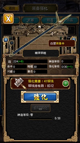 另外,在劇情體驗到一定階段之后,玩家還可以消耗一定的金幣來強化自身裝備,強化是100%成功的,不過不可高于自身元神等級。而當(dāng)強化滿級之后還可提升武器和裝備的“神造等級”。