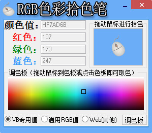 RGB色彩拾色筆是一款屏幕取色器,它小巧不占內(nèi)存,且綠色無病毒,免安裝。只要拖動鼠標(biāo)到色板或者點擊色板即可輕輕松松取色。主要用于VB,PS,WEB制作等的色彩取色,減輕了程序員的工作負(fù)擔(dān)。