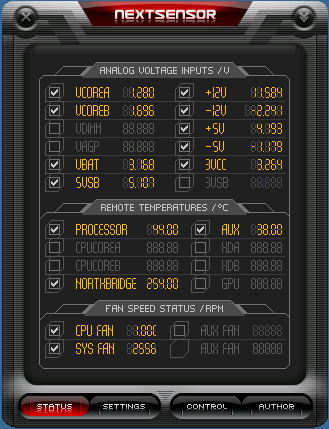 NextSensor是一個(gè)簡單易用的溫度和電壓監(jiān)測工具,并且有著完善的圖形界面。它以系統(tǒng)它可以檢測Vcore,VDIMM,VAGP,VBAT,5VSB,3VSB,+12,-12,+5V,-5V,+3.3V等電壓值大小,并能檢測包括處理器,北橋和硬盤在內(nèi)的溫度,并能以分段LED方式顯示在系統(tǒng)欄里。另外,它還能夠提供負(fù)值顯示和多達(dá)3個(gè)風(fēng)扇支持,不失為超頻用戶的得力助手。