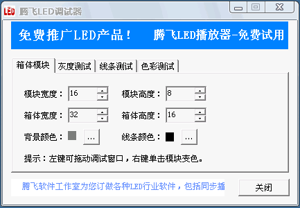 騰飛LED顯示屏輔助調(diào)試軟件,可以根據(jù)鼠標(biāo)位置顯示當(dāng)前像素所在箱體和模塊,方便大屏幕的維修和調(diào)試,還可對大屏幕進行線條測試、灰度測試、色彩測試等各種常用測試。