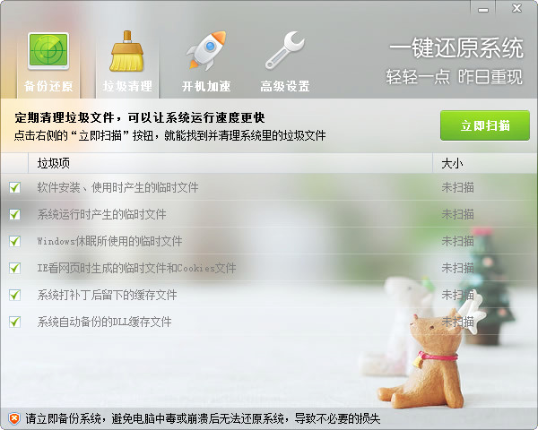 快速還原,昨日重現(xiàn) 若感染病毒木馬或系統(tǒng)崩潰,快速恢復(fù)到健康狀態(tài)。