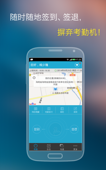 手機端采用GPS、Wi-Fi、基站三種定位技術(shù),智能選擇定位方式,使用戶在不同環(huán)境下,均可精準定位,輕松完成上下班打卡、請假審批、工作日志填報、同事溝通等諸多操作。