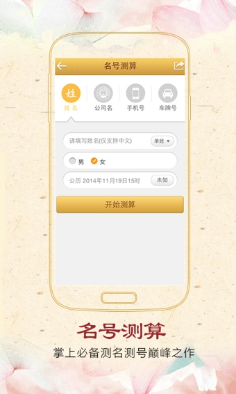 名號測算是測名改名、手機(jī)/電話/車牌號碼測算最精準(zhǔn),內(nèi)容最豐富的移動運(yùn)勢應(yīng)用!