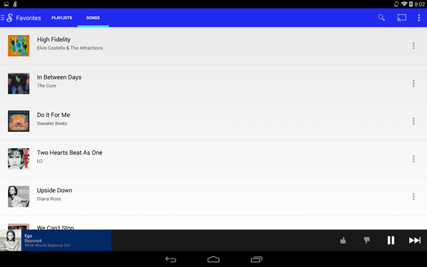 Songza能根據(jù)不同時間、不同地點、不同情境,隨機(jī)為用戶生成歌單,打開Songza,可以看到應(yīng)用下部的5個按鈕:“Concierge”、“我的歌單”、“流行”、“探索”和“選項”。其中“Concierge”(這是一個法語單詞,意思是賓館的迎賓部,軟件開發(fā)者起這么個名字,大約是為了表明用戶體驗“賓至如歸”)是這款應(yīng)用最具特色的功能。打開這一界面后,Songza會首先識別系統(tǒng)時間,如“星期一下午”,然后列出6個自動生成的歌單,比如下圖中的“夏日”、“提神”、“新歌”、“舞會”、“按摩”和“傳世名曲”。點擊任一歌單,即可欣賞與當(dāng)前情境相匹配的音樂。【更新日志】