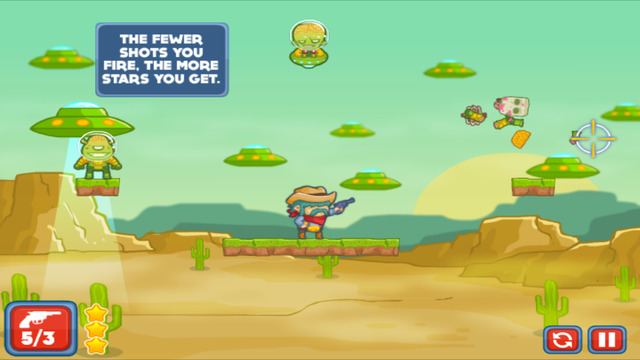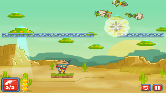 60個難度遞增的游戲關卡,完美三星通關;卡通的游戲畫面,搞怪的牛仔外星人造型;