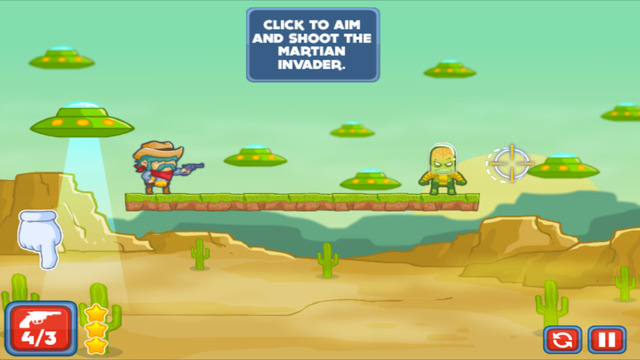 《牛仔對戰(zhàn)外星人 Cowboy vs Martians》是一款非常有趣休閑益智游戲。玩家需要控制自己射擊的方向?qū)⑼庑侨讼麥?,游戲操作很簡單,點擊屏幕可以選擇方向,點擊左下方的按鈕即可射擊,使用越少的子彈完成關卡獲得的評價就會越高。游戲關卡到了后期還會出現(xiàn)各種不同的障礙和道具,比如需要多次射擊才能破壞的障礙,可以引爆破壞周圍物品的道具等。是不是很有意思,喜歡的玩家趕快下載體驗吧。【游戲背景】