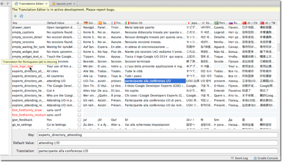 Android Studio還提供了可供所有app使用的字符串翻譯編輯器。該編輯器可以將任意項目里面硬編碼的字符串析取出來并進行分析。這一點對于app的本地化非常有用。