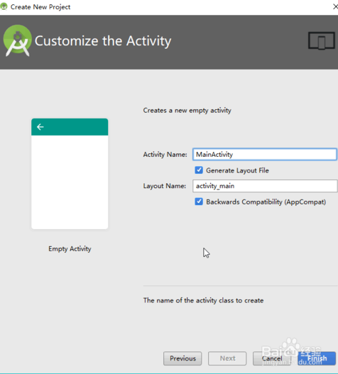 Activity名字和Layout名字都可以不去修改,點擊“Finish”,第一個Hello World工程就創(chuàng)建好啦。