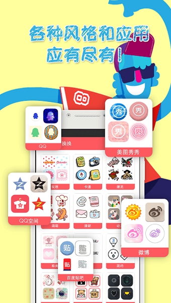 來自世界各地的成百上千款紋理、卡通、潮流、萌、清新、動漫、唯美、透明、簡約、田園、寵物、暗黑的圖標任你選擇。