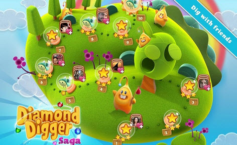 Diamond Digger Saga《鉆石礦工傳奇》基本上是一個(gè)寶石版的《糖果粉碎傳奇》。游戲中,主角是一個(gè)戴著探照燈的可愛礦工,名字叫Diggy。Diggy負(fù)責(zé)挖Diamond Dale、Turquoise Meringue和其他的寶石。