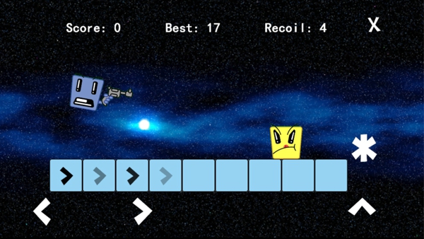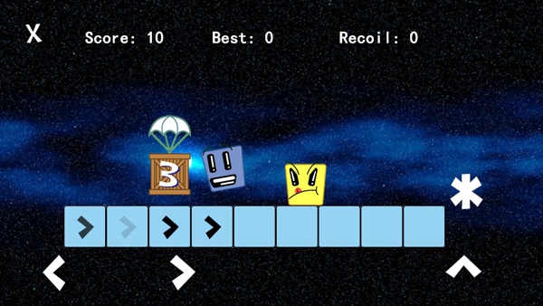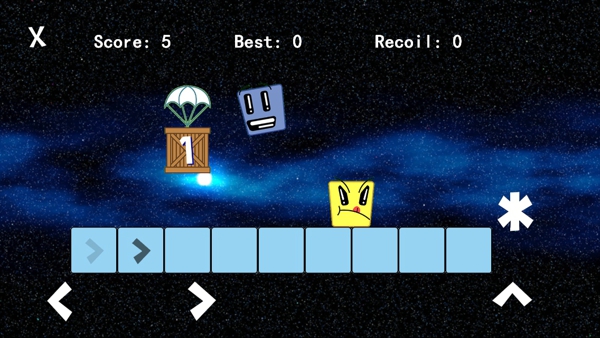 《爆炸人!( Bang Man! )》是一款游戲背景設(shè)定在太空里面的一個(gè)射擊游戲,游戲里面你扮演一快深藍(lán)色小方塊和平臺上的外星人激戰(zhàn)。每消滅一個(gè)敵人,接下來降落的敵人速度都會(huì)提升一次,當(dāng)然,掉落的也不一定全是敵人,也可能是可以使敵人暫時(shí)降速的有力道具。