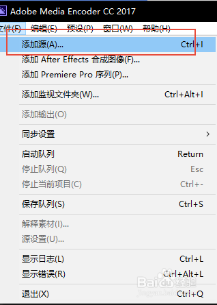 ame同時(shí)也可以用來制作我們的電腦的視頻的格式轉(zhuǎn)換,其轉(zhuǎn)換的程序和合成文件的格式一樣,就需要點(diǎn)擊文件,然后添加進(jìn)入一個(gè)視頻的文件源就行拉!下面的都是一一樣的!