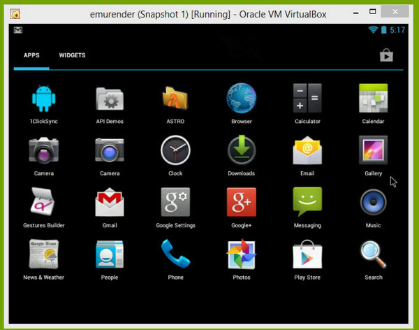 第四步:現(xiàn)在你就應(yīng)該會(huì)看到一個(gè)標(biāo)準(zhǔn)的Android主屏幕界面了??梢杂檬髽?biāo)或是觸摸屏進(jìn)行滑動(dòng)切換操作,另外還有一個(gè)全屏按鍵,點(diǎn)擊后電腦就會(huì)變成一款A(yù)ndroid設(shè)備(可惜的是Windows 任務(wù)欄依然會(huì)顯示)。下面,不管是使用谷歌商店下載應(yīng)用、玩游戲,都可以實(shí)現(xiàn)了。