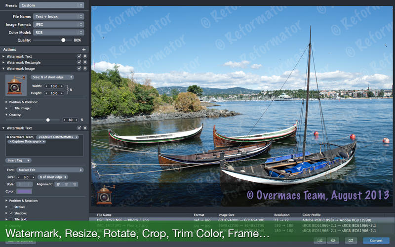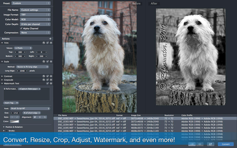 Reformator for Mac是一款在Mac平臺上的圖像處理軟件,它可以幫助你批量轉(zhuǎn)換圖片,不僅支持多種圖片格式,而且還可以幫助你添加水印文字、照片調(diào)整(亮度/飽和度/曝光/灰度/等)、配合幾何(規(guī)模/修剪/等)、刪除私人的元數(shù)據(jù),添加自己的版權(quán)等。此外,Reformator是一個偉大的工具來瀏覽你的照片用了最新的照片瀏覽器,和QuickLook預覽,圖像信息面板。此外,您必須使用內(nèi)置的搜索工具多達30個的標準,組照片被拍攝日期,圖像格式等來搜索照片的機會。