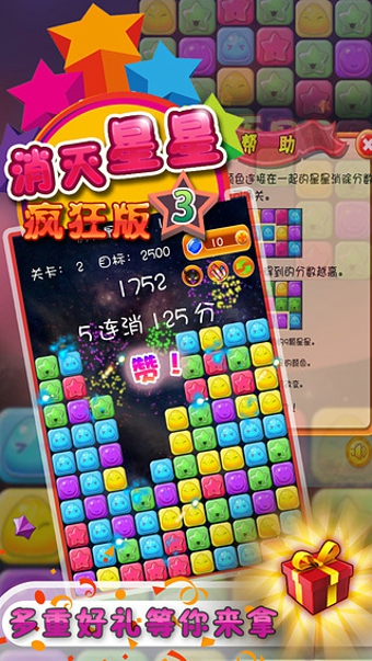 消滅星星3瘋狂版下載是一款休閑益智類的消除游戲。該游戲是在原有的基礎上加以改進,形成了這款瘋狂版本,該版本具有之前沒有的華麗道具,可以幫助玩家快速通關。