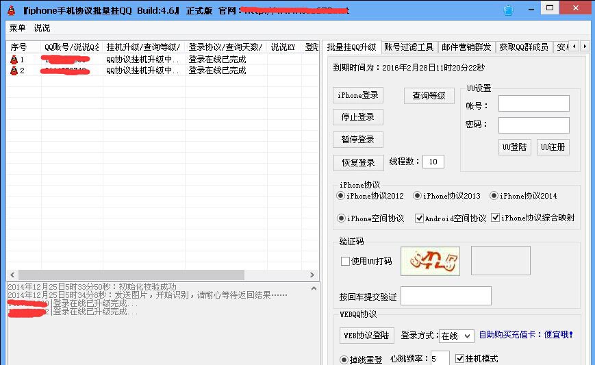 支持iphone批量掛QQ在線,支持WEB協(xié)議掛QQ,增加篩選重復(fù)帳號(hào).郵件群發(fā)等功能!批量導(dǎo)入文件或直接拖放文件