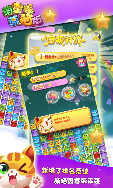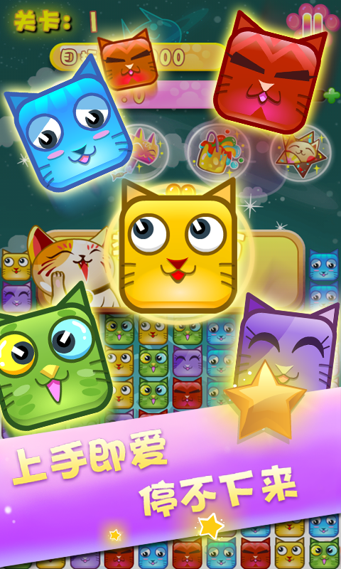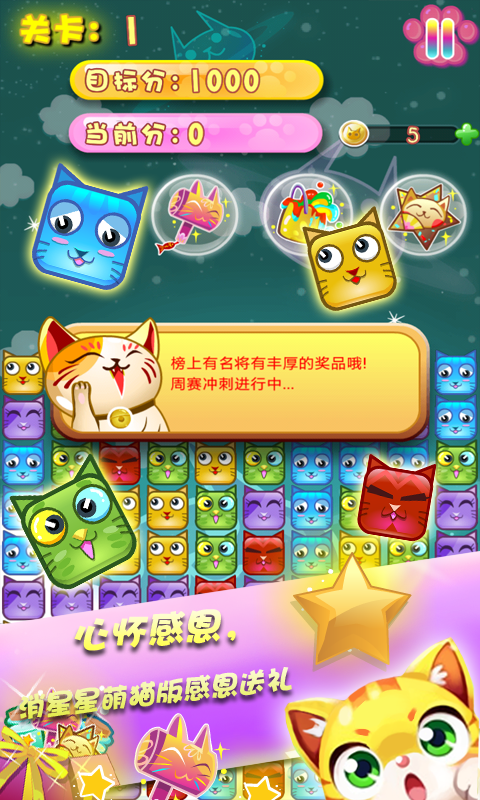 雖說看起來只是一個(gè)普通的三消除游戲,但無論是在畫面的效果制作,還是關(guān)卡的設(shè)計(jì)方面都是同類游戲中不可多得的,同樣的玩法,卻有著完全不同的游戲體驗(yàn),游戲中的道具是特色之一,合理的利用道具次啊是勝利的關(guān)鍵。消星星萌貓版有機(jī)會(huì)得獎(jiǎng),蘋果手機(jī)、IPAD、小米手機(jī)、話費(fèi)、金幣玩就送,消星星萌貓版每周排位賽開始了,周賽排名前十的用戶即可領(lǐng)取上述禮品