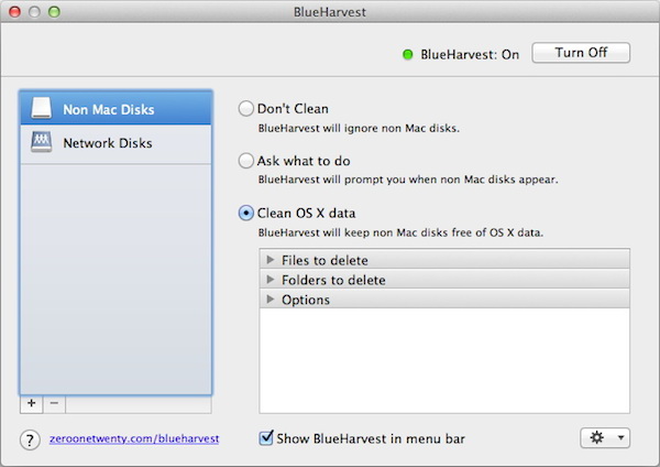 BlueHarvest for mac是Mac os平臺(tái)上的一款幫助用戶快速清理系統(tǒng)垃圾的Mac軟件,BlueHarvest for mac可以從您的 U盤,音樂(lè)播放器,SD卡和文件服務(wù)器等設(shè)備中自動(dòng)刪除 DS_Store 和 _ AppleDouble 文件。【軟件特點(diǎn)】