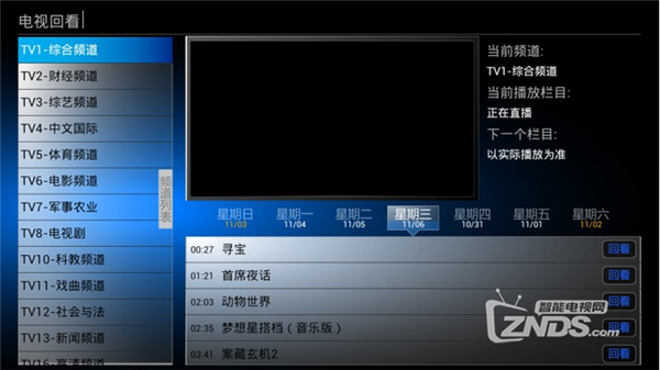 選擇“網(wǎng)絡(luò)電視”按OK鍵進(jìn)入選擇“電視回播”,進(jìn)入電視回播。左邊選擇頻道,右邊小窗口預(yù)覽播放,底下選擇一周回播的時(shí)間,下面選擇節(jié)目播放。
