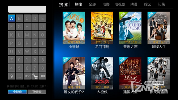 搜索支持全鍵盤和T9鍵盤兩種搜索,輸入要搜索影片的拼音首字母搜索。搜索到的視頻可以選擇屏幕上方的視頻分類篩選過濾影片。