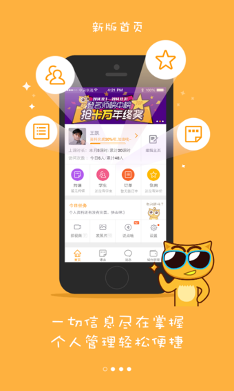 1. 老師主頁(yè):老師填寫個(gè)人資料、簡(jiǎn)歷、教學(xué)成果,并上傳照片、視頻。就能擁有自己獨(dú)一無(wú)二的老師主頁(yè)。2. 課表管理:輕松管理學(xué)生約課,一鍵查詢學(xué)生信息,并決定是否接受約課。確認(rèn)約課后,按照約定的時(shí)間、地點(diǎn)、上課方式授課。