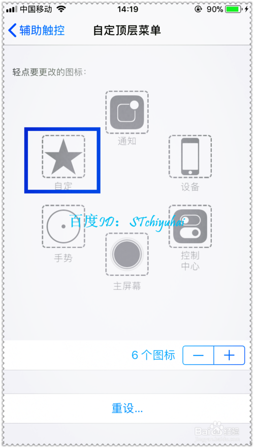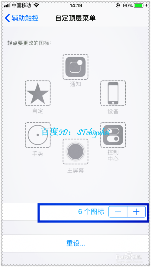 選擇好這個(gè)功能選擇完成,這個(gè)快捷替換就會(huì)顯示在AssistiveTouch(輔助控制)頂層操作界面上,后續(xù)就可以方便操作了,對(duì)于初始的6個(gè)按鍵如果覺得太多可以減少,太少可以增加,點(diǎn)擊底下+-便可。