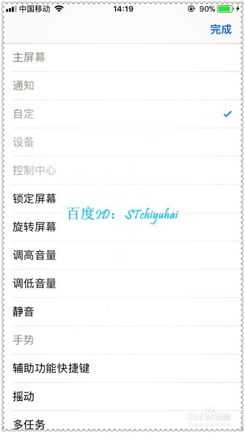點(diǎn)擊第二欄,自定義頂層菜單,可以進(jìn)入自定義界面,看到初始的菜單:通知、設(shè)備、控制中心、主屏幕、手勢(shì)、自定等,這些都是常見的操作,可以根據(jù)自己的使用習(xí)慣替換掉一些。