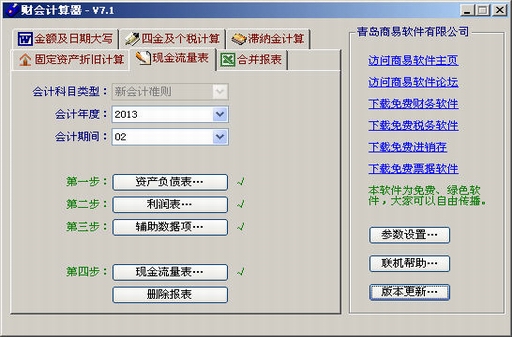 1、主要功能:金額及日期大寫、四金及個(gè)稅計(jì)算(養(yǎng)老保險(xiǎn)金、醫(yī)療保險(xiǎn)金、失業(yè)保險(xiǎn)金、住房公積金、個(gè)人所得稅)、滯納金計(jì)算 、固定資產(chǎn)凈殘值計(jì)算、固定資產(chǎn)折舊計(jì)算(平均年限法、工作量法、雙倍余額遞減法、年數(shù)總和法)、 現(xiàn)金流量表(可以在填寫資產(chǎn)負(fù)債表、利潤(rùn)表和輔助數(shù)據(jù)項(xiàng)之后,快速生成現(xiàn)金流量表。此外,還可以及時(shí)糾正錯(cuò)誤、自動(dòng)調(diào)平。)、合并報(bào)表(適用于對(duì)各種財(cái)務(wù)報(bào)表進(jìn)行合并)。