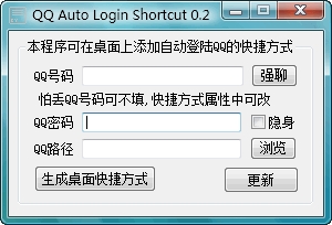 可以用來創(chuàng)建QQ,TM,QQ游戲等自動(dòng)登陸的快捷方式,免去輸入密碼提高安全性,附加強(qiáng)行聊天功能,適合一人有多QQ個(gè)用戶使用